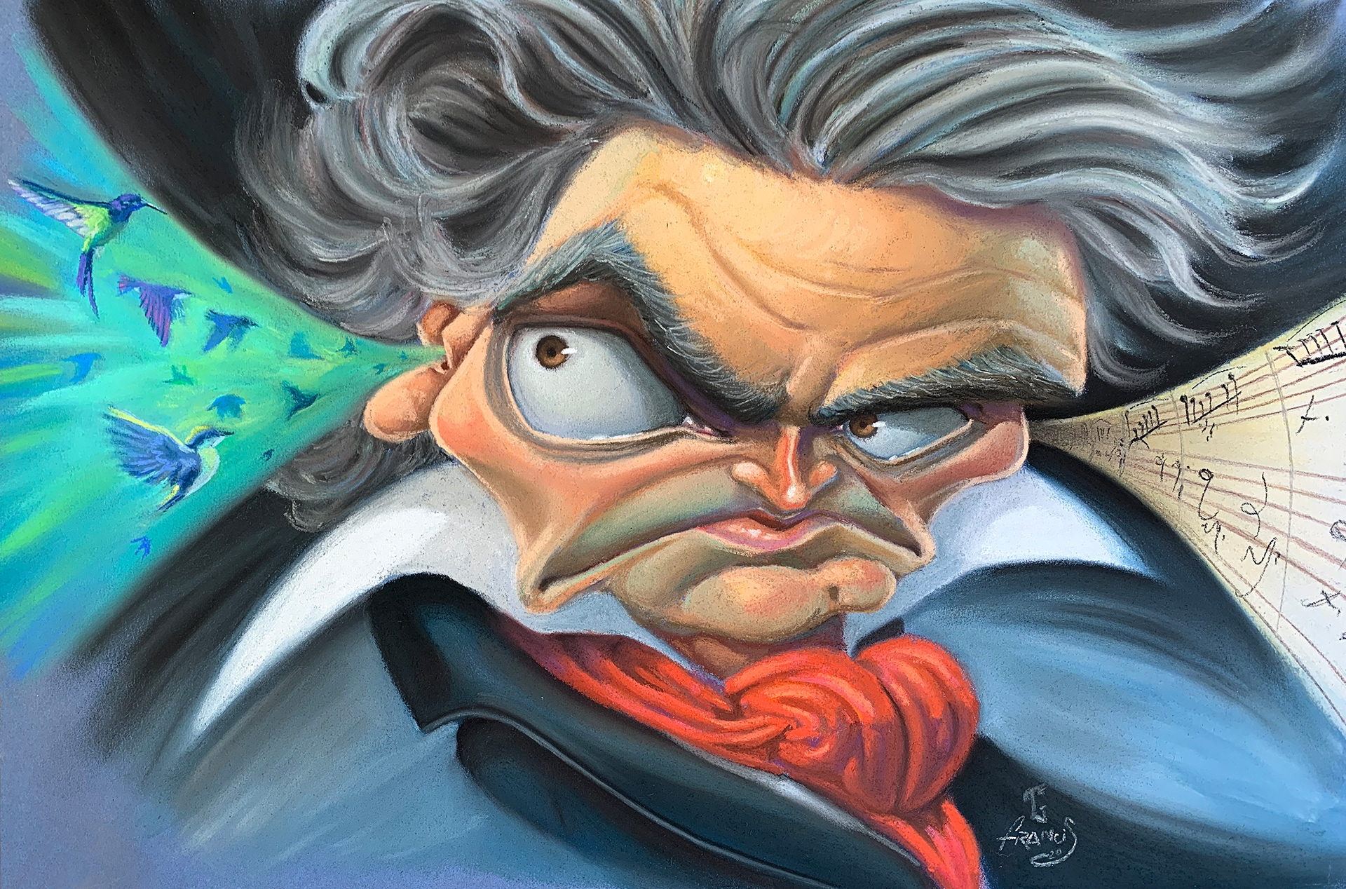 Caricatura de Beethoven realizada na técnica de Giz Pastel Seco (koh-i-noor) sob Papel (Canson Color 190g).